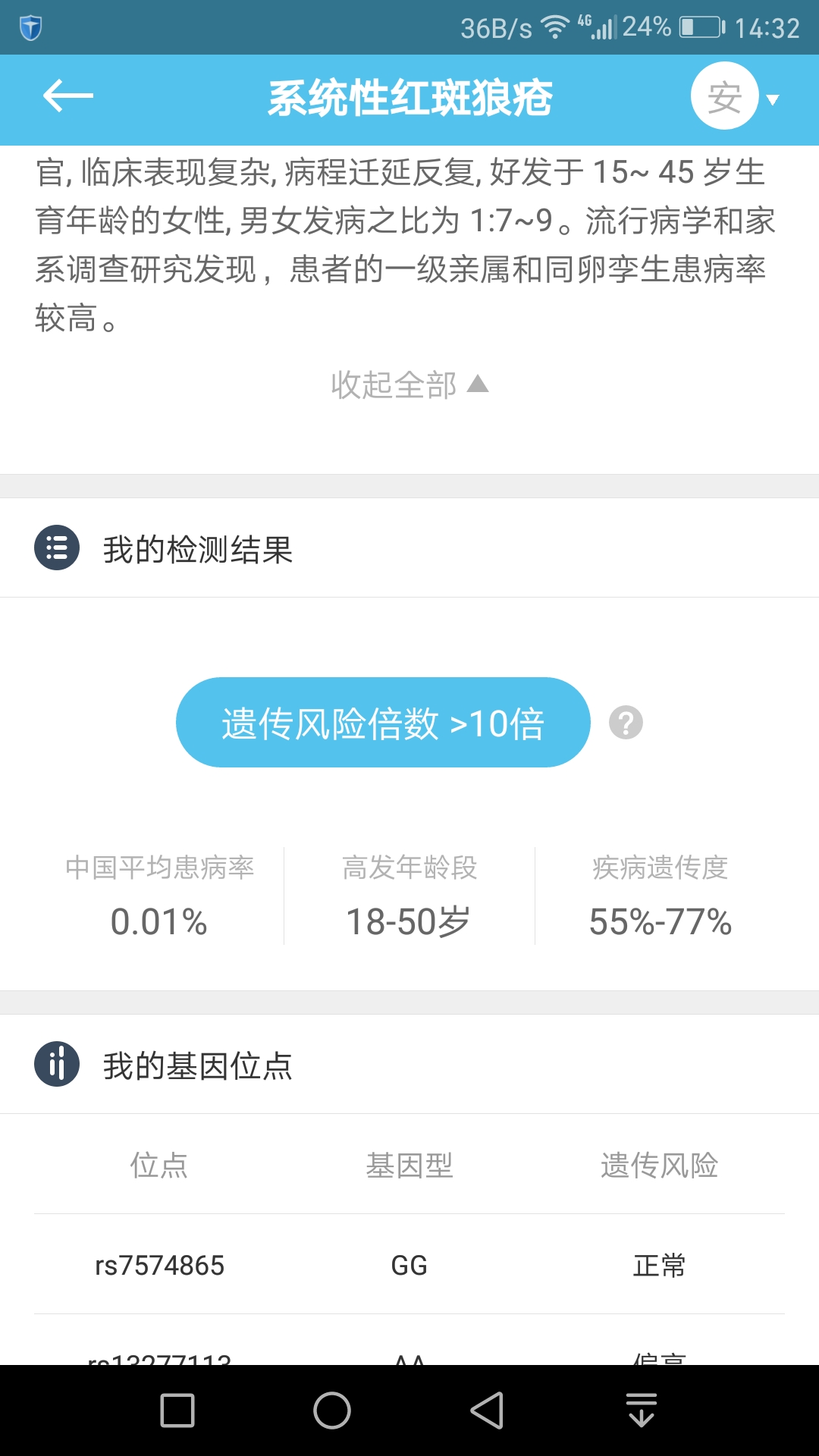 举报该帖子 我的近亲家族都没有红斑狼疮,为什么我的遗传风险那么高2017-08-10· 2351 浏览2 评论郑 郑 我的近亲家族都没有红斑狼疮,为什么我的遗传风险那么高? 2 条评论 热门最新 开心🐱 2017-08-11跟免疫系统有关系,这个病貌似发病率很低的,应该没有大问题。添加评论点赞 举报该评论 举报该评论 举报类型 违法违规 色情低俗 时政不实信息 引导站外加群 冒充他人 谩骂攻击 网络暴力 其他 无数据 举报描述 举报截图 提交取消评论郑 郑 2017-08-10添加评论点赞 举报该评论 举报该评论 举报类型 违法违规 色情低俗 时政不实信息 引导站外加群 冒充他人 谩骂攻击 网络暴力 其他 无数据 举报描述 举报截图 提交取消评论 图片关联家族你保存和创建的家族 完成关联单倍群 完成提交评论