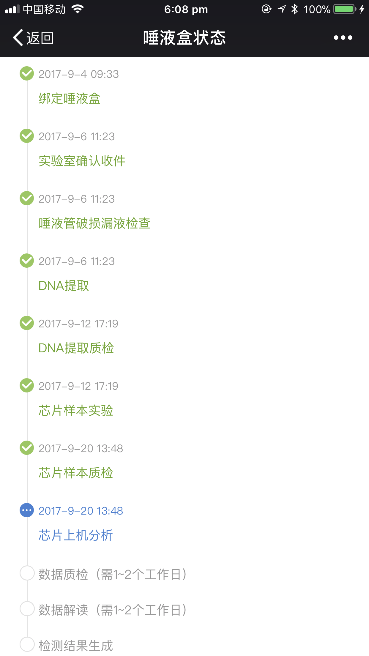 举报该帖子 请问现在进度到了“芯片上机分析”这一项大概要等多久才会继续进度?2017-09-20· 1500 浏览2 评论 Luke 就是好奇询问一下,这几项都没有参考时间。。 2 条评论 热门最新 吴佳励 2017-09-20我是今天一下就跳到可以查看报告了,结果检测项目和别人差太多了,不高兴。1 评论点赞 举报该评论 举报该评论 举报类型 违法违规 色情低俗 时政不实信息 引导站外加群 冒充他人 谩骂攻击 网络暴力 其他 无数据 举报描述 举报截图 提交NO Novank 2017-09-20我之前也是这样。点赞 举报该评论 举报该评论 举报类型 违法违规 色情低俗 时政不实信息 引导站外加群 冒充他人 谩骂攻击 网络暴力 其他 无数据 举报描述 举报截图 提交取消评论取消评论 图片关联家族你保存和创建的家族 完成关联单倍群 完成提交评论
