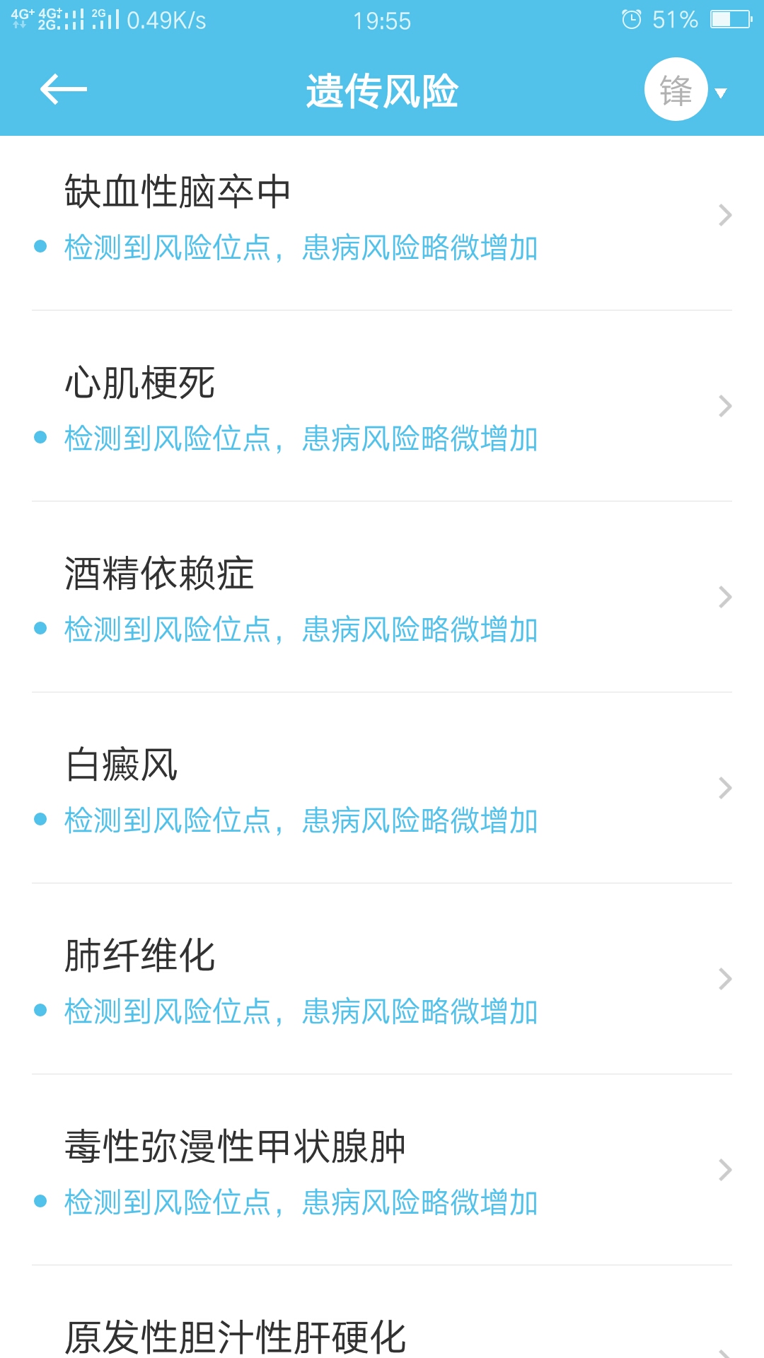 靛蓝心光 2017-10-31楼主不多啊,我有11项,但是有的真不准,比如它说我高血压风险略微增加,实际上我是低血压,我全家都低血压。。。添加评论1 赞 举报该评论 举报该评论 举报类型 违法违规 色情低俗 时政不实信息 引导站外加群 冒充他人 谩骂攻击 网络暴力 其他 无数据 举报描述 举报截图 提交取消评论