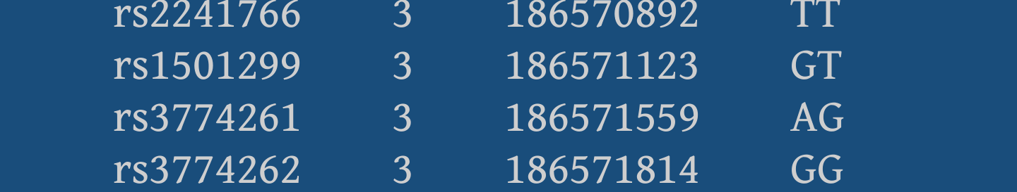 4、2型糖尿病,rs1501299,AC突变,可是原始数据中rs1501299基因型为GT。