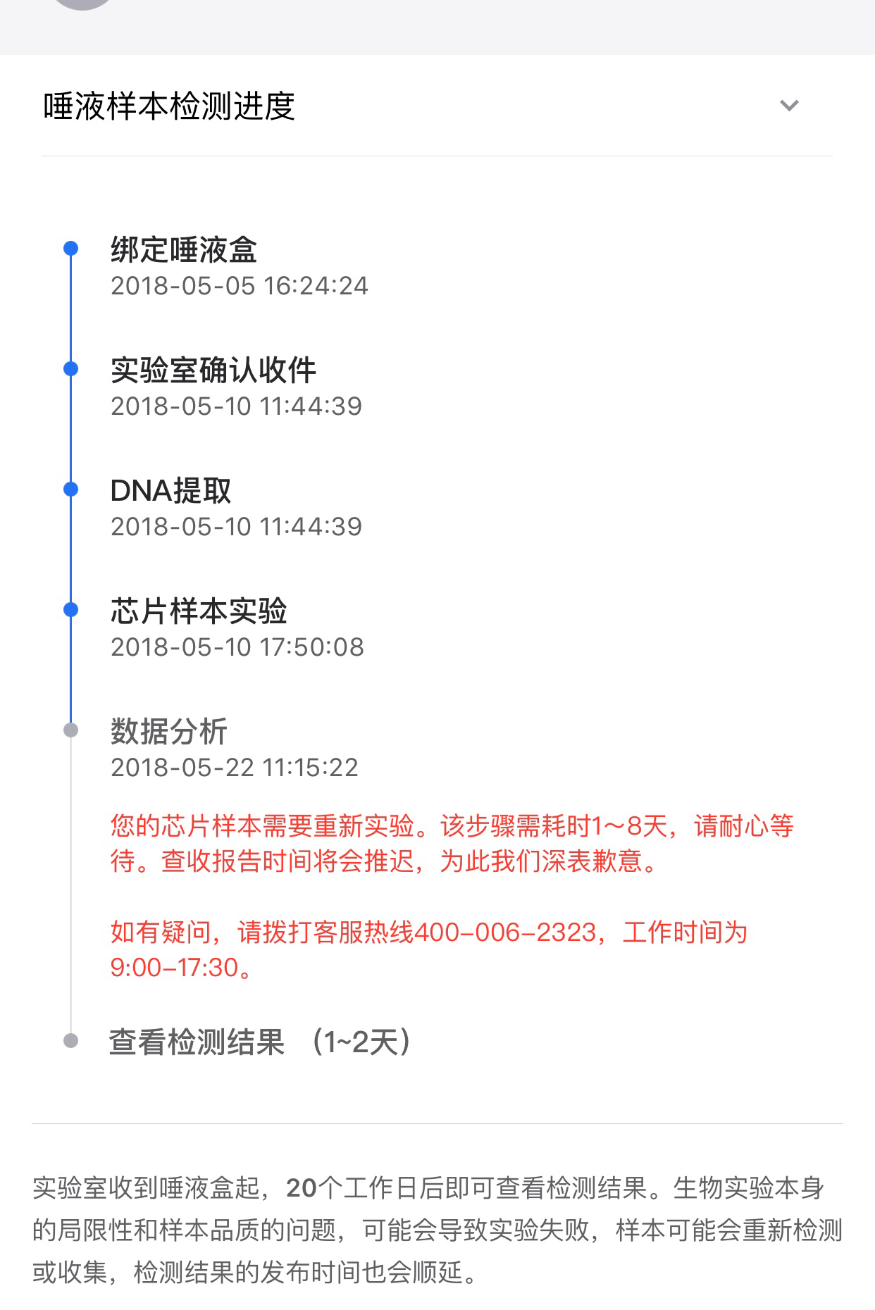 尾巴 尾巴 2018-05-26我也本来以为数据分析一两天就完成了……可能数据分析这里需要重新做一下?3 评论点赞 举报该评论 举报该评论 举报类型 违法违规 色情低俗 时政不实信息 引导站外加群 冒充他人 谩骂攻击 网络暴力 其他 无数据 举报描述 举报截图 提交 周 2018-05-26一年前弄的没问题 我朋友跟我同时做的也没问题 就我的两支说要重做 她的都出结果了点赞 举报该评论 举报该评论 举报类型 违法违规 色情低俗 时政不实信息 引导站外加群 冒充他人 谩骂攻击 网络暴力 其他 无数据 举报描述 举报截图 提交取消评论尾巴 尾巴 2018-05-26@周:2333 可能是哪个试验环节没有达到预期。不需要重新寄回来吐口水就行……点赞 举报该评论 举报该评论 举报类型 违法违规 色情低俗 时政不实信息 引导站外加群 冒充他人 谩骂攻击 网络暴力 其他 无数据 举报描述 举报截图 提交取消评论取消评论