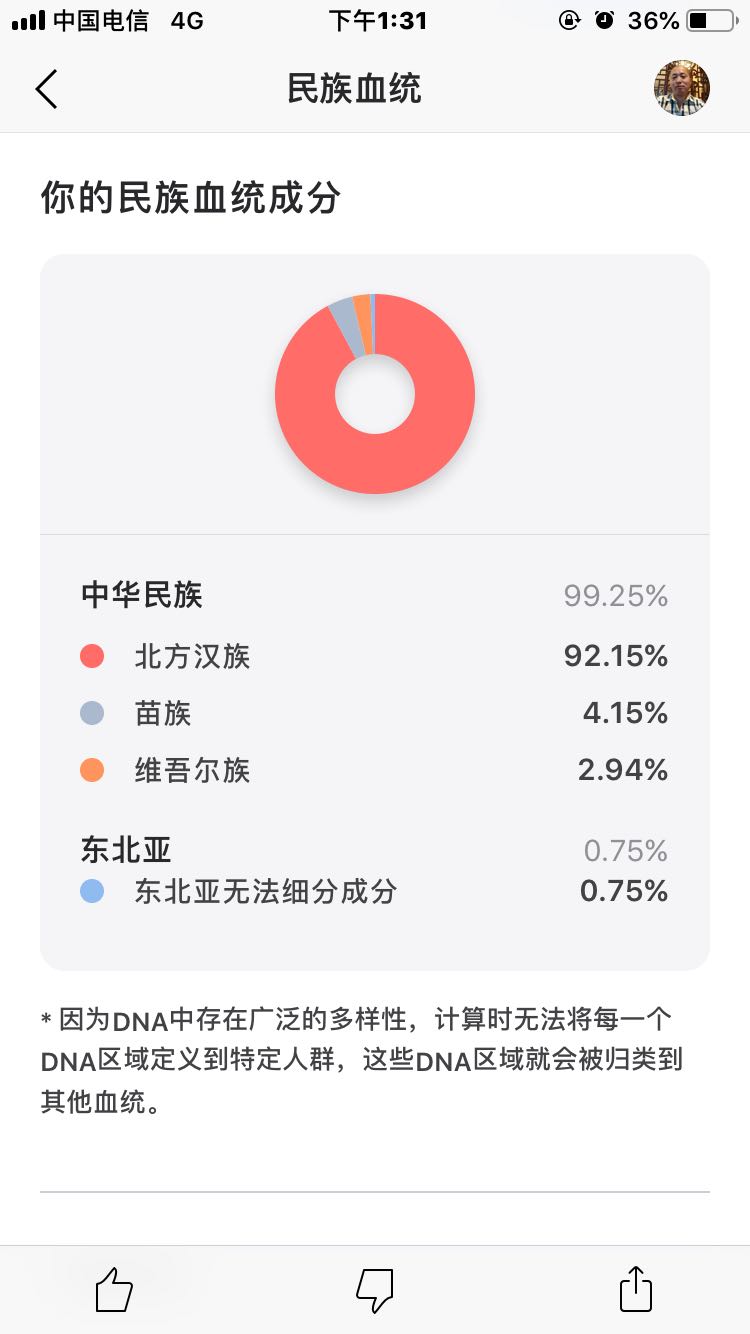 老哥,咱俩基因基本一样,OF402,百分之5的苗族,3的维族,我是甘肃汉族