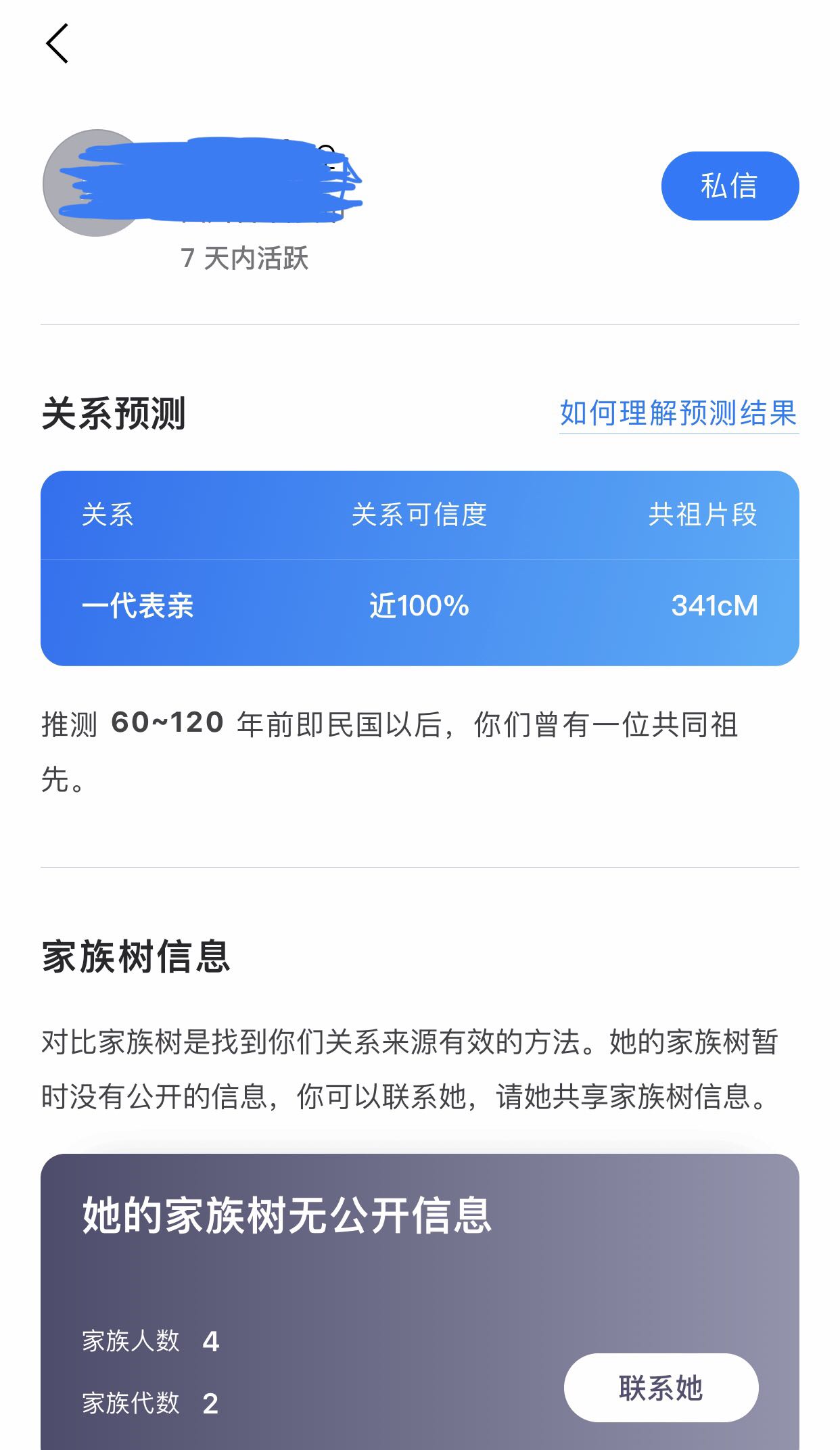 我跟我姥姥妹妹的孩子我叫姨是300多,她闺女我妹妹是100多,分别显示的一代二代表亲
