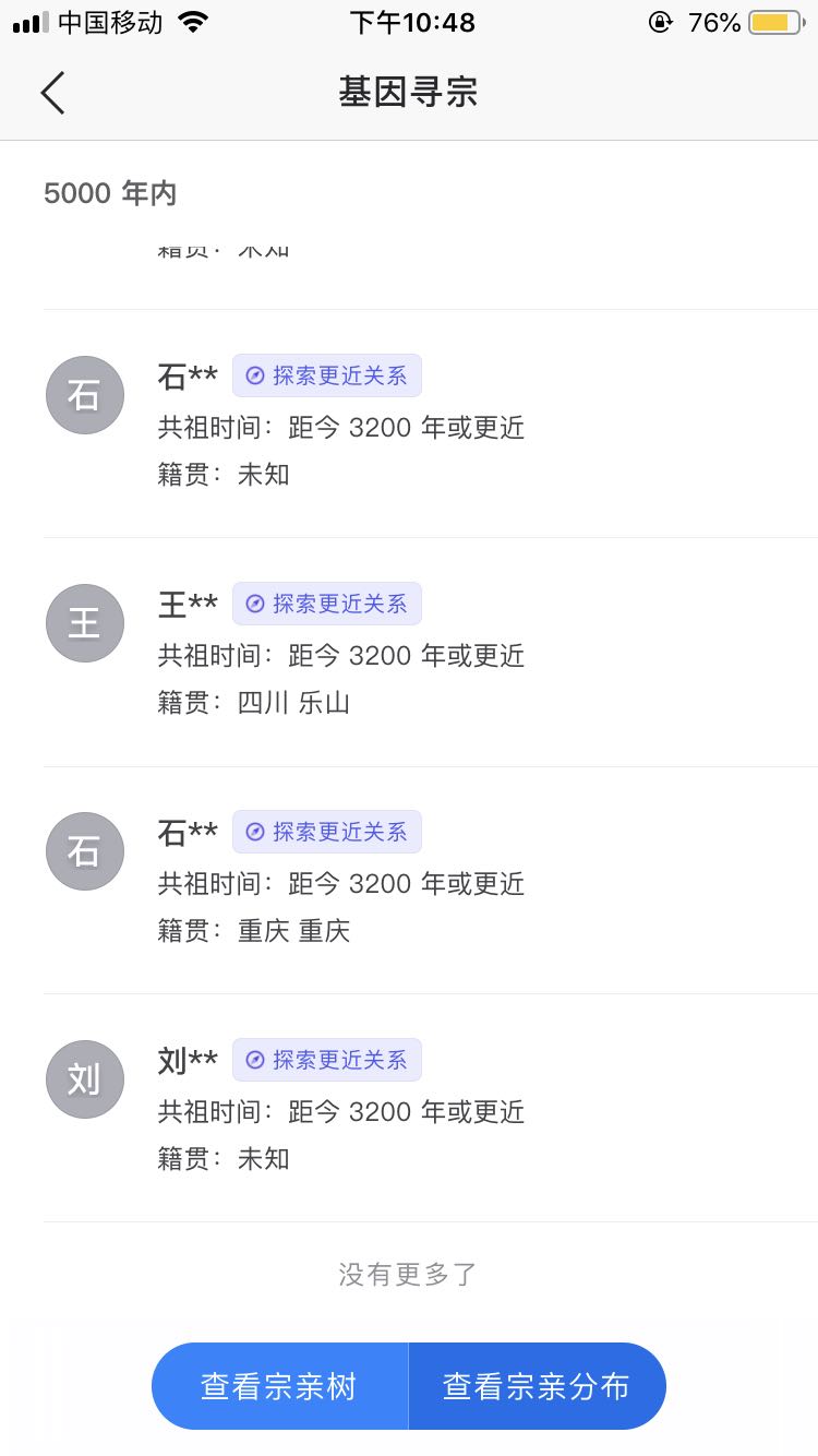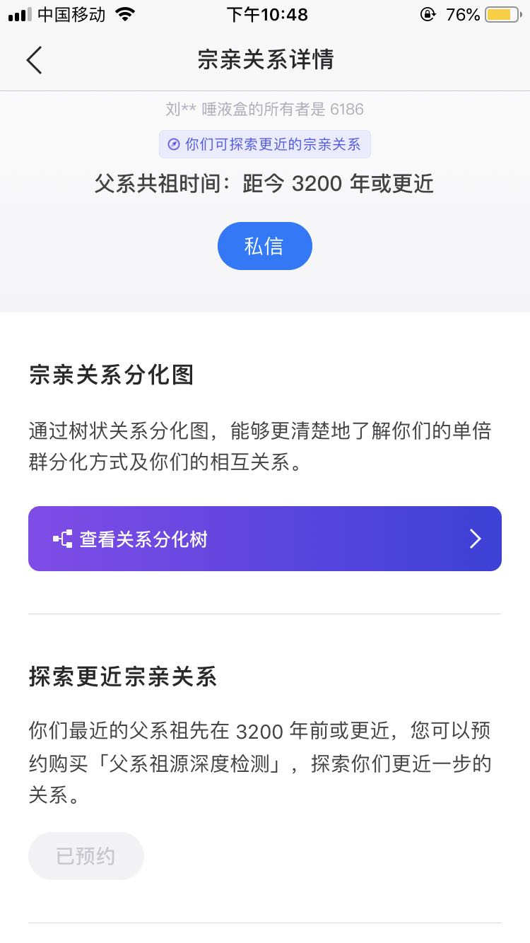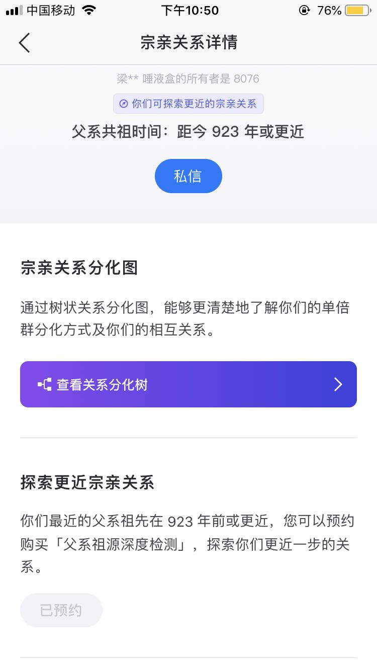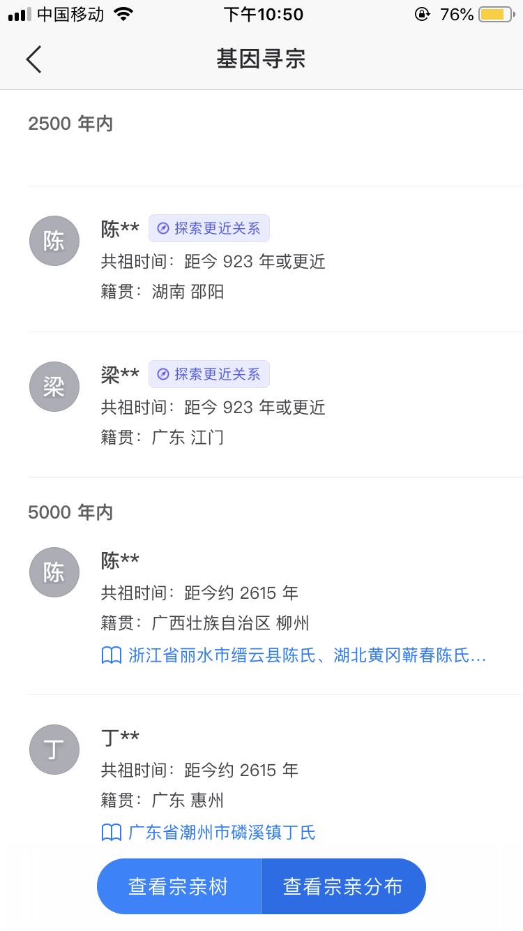 基因寻宗那里,C的全是共祖3200年的,有198人。O有41人共祖923年,还有一堆人共祖2615年、5700年甚至更久。C的可以请求与全部198人探索更近的基因关系(预约高通),O的只能申请与其共祖923年的41人探索更近基因关系。