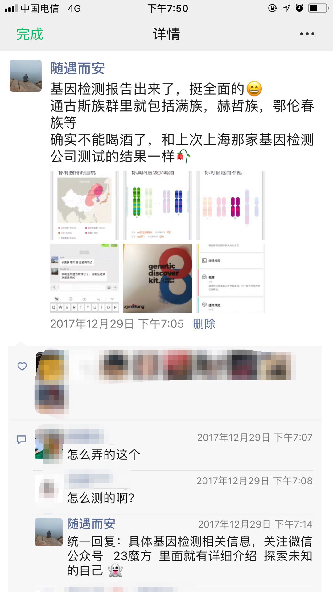 很快就有23魔方的工作人员联系到了我,在提交完相关材料后,我就收到了可爱的魔方盒。大概一周的时间就在App里看到了我的祖源信息,当时还特意的发了朋友圈纪念一下,引起了很多小伙伴的吃瓜围观。