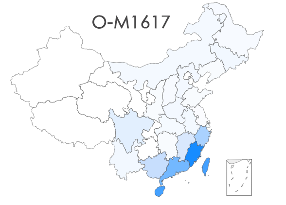 16. 吴郡顾氏家族。所在支系 O-F1056,共祖年龄 1960 年,全国人口占比 0.23% 左右。该家族高度集中于苏州地区,约占 3.3% 的比例。其次是苏州周边的上海郊县、嘉兴、南通,可达 2%~2.5%,再次是上海城区、无锡、常州、泰州、盐城、湖州,可达 1%~2%。因此,这个支系呈现出在苏州高度集中、以苏州为中心向外发散的分布态势。该支系可能是苏州地区自秦汉以来人丁最为兴旺的家族。代表了江南地区汉朝以来的历史悠久的家族。