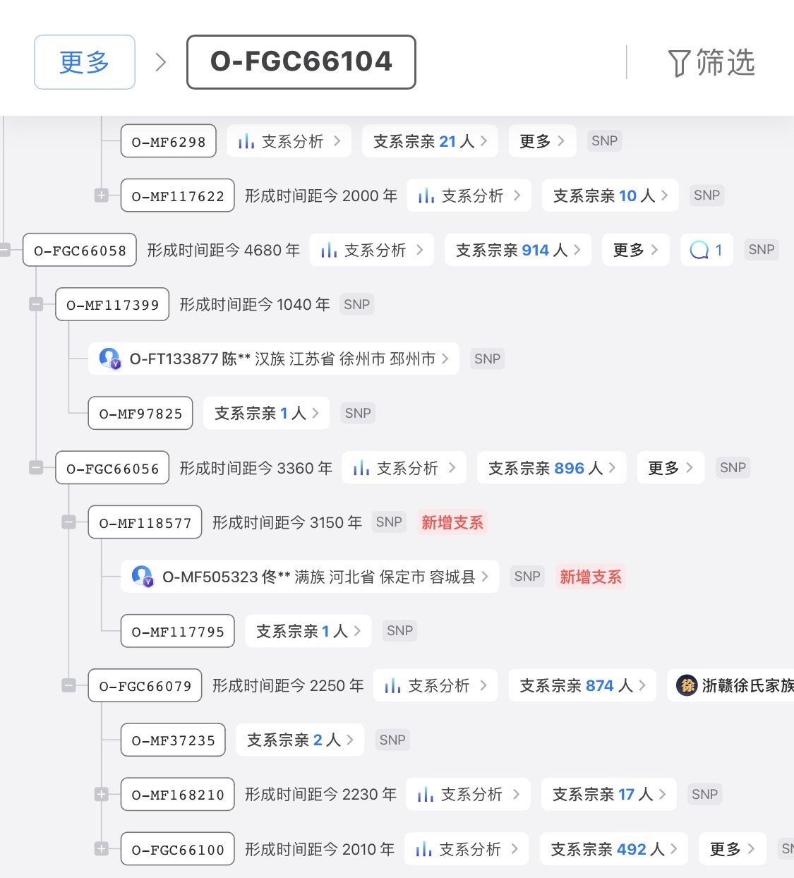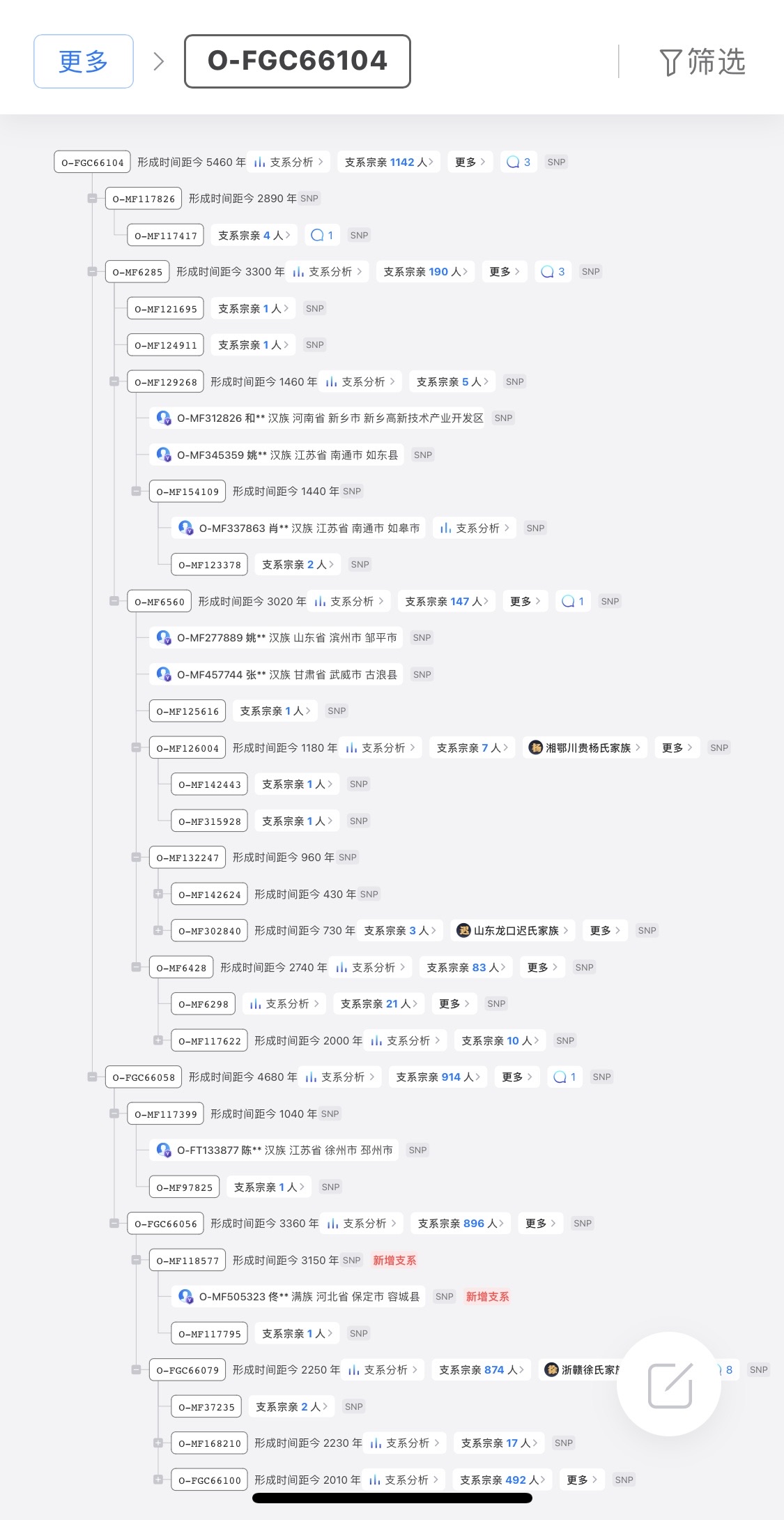O-FGC66104(共祖于5460年前),高频在江苏山西,辽宁几个地方,而山东河北也有不低的瓶率,但实际上,66104主要分布在江苏北部和环渤海一带,原因在于上游89818的另一个分支47757根支分布在江苏太湖一带(且有日韩支),推测66104从89818分离后从江淮一带北上至苏北鲁南。而66104的MF117826是一个日本支(日本铃木氏),怀疑是由环渤海一带度船到达日本,时间应控制在秦汉以内。FGC66104的下游一级分支不论是MF6285还是FGC66058都集中在苏北鲁南一带。这点也显而易见,不论是共祖时间还是分布地区,皆和花厅对应,故推测其为花厅文化南区(归属大汶口文化)一方首领。