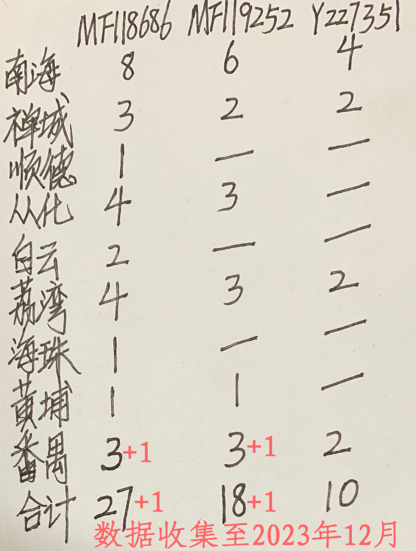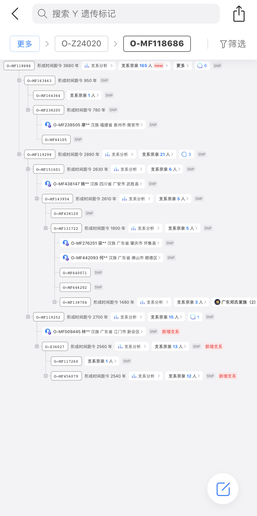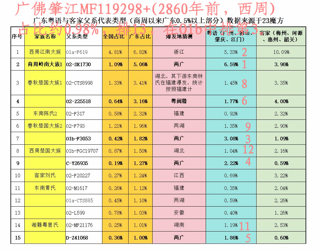 先来开篇。从宏观上看,以23魔方69个高通(或点测)样本为统计,从MF118686(3680年前),到2890年前,到2700年前,到Y227351(2180年)前,约一千五百年时间,分布逐渐向广州、佛山、肇庆、江门地区高度集中。