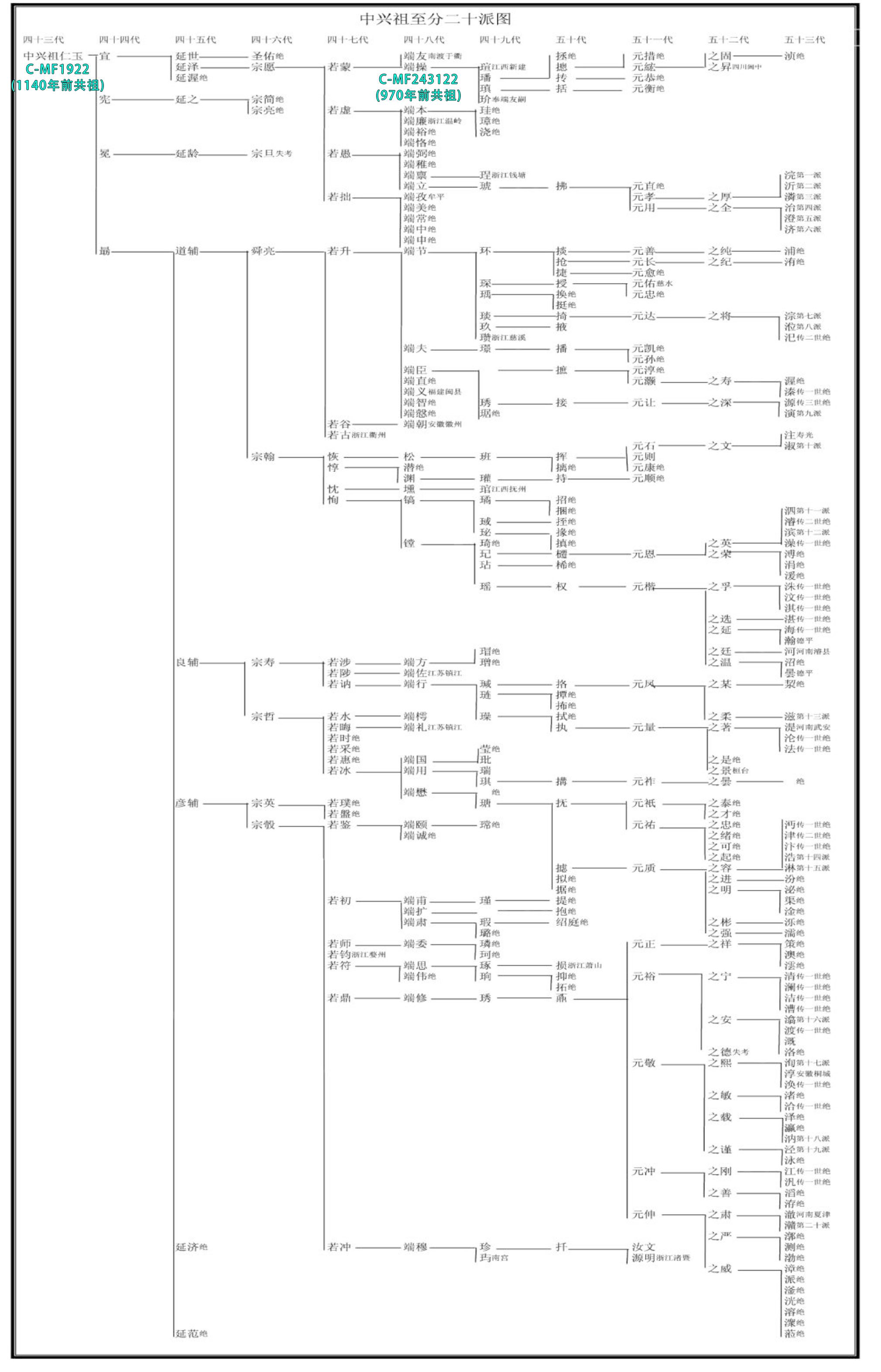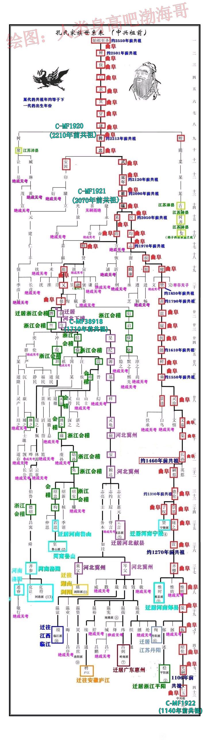 根据孔子家族谱系树结合23魔方C-MF1920分化树 绘制如上三图目前Q-MF30796样本出现于大宗户和滕阳户,二者均为孔思晦这一派。