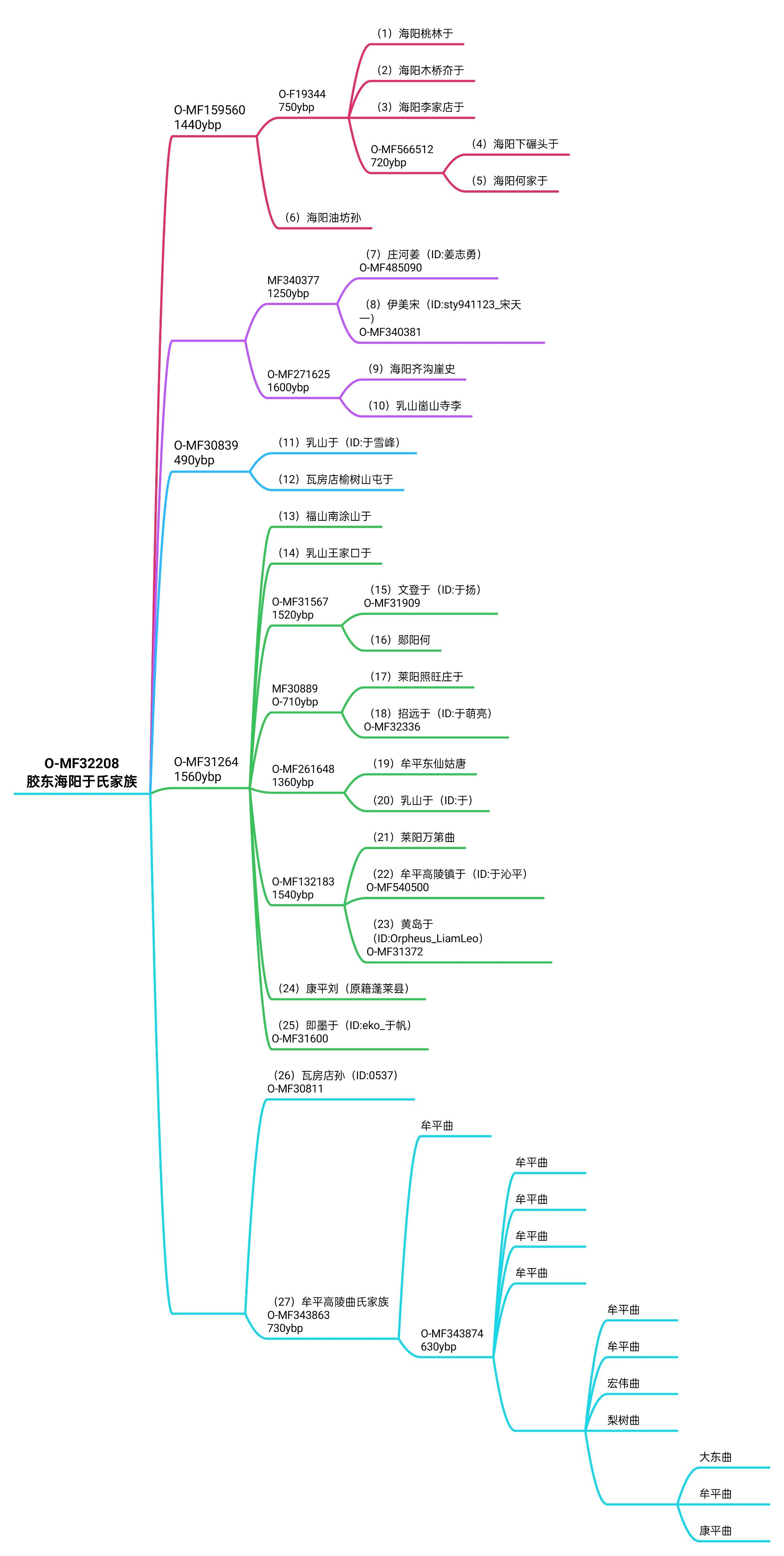 按数据库内样本看,O-MF32208支海阳于姓家族下除了分化出著族牟平高陵曲氏家族外,疑似还有几个具有相当规模且值得关注的家族簇,如海阳西北乡一支姜氏家族、海阳一支辛氏家族、泛胶东一支宋氏家族等,希望更多的好朋友参与细化这些姓氏家族。
