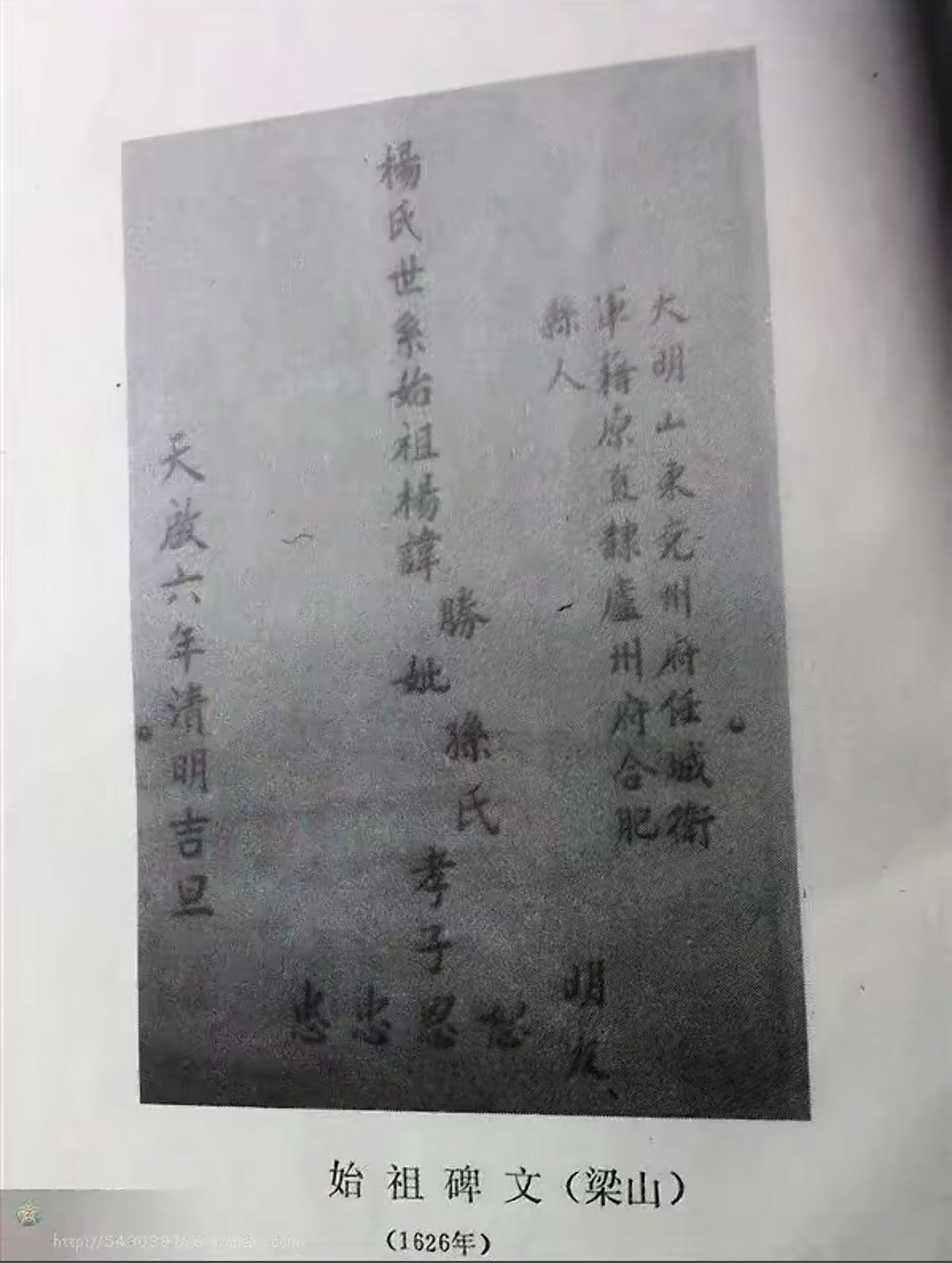 大明洪武十八年,杨氏始迁祖杨胜(济州卫指挥使),杨胜爷原籍庐州府合肥大隅首人,枪法神勇,护明太祖第十子鲁王檀就藩兖州府,定居梁山南杨家集。