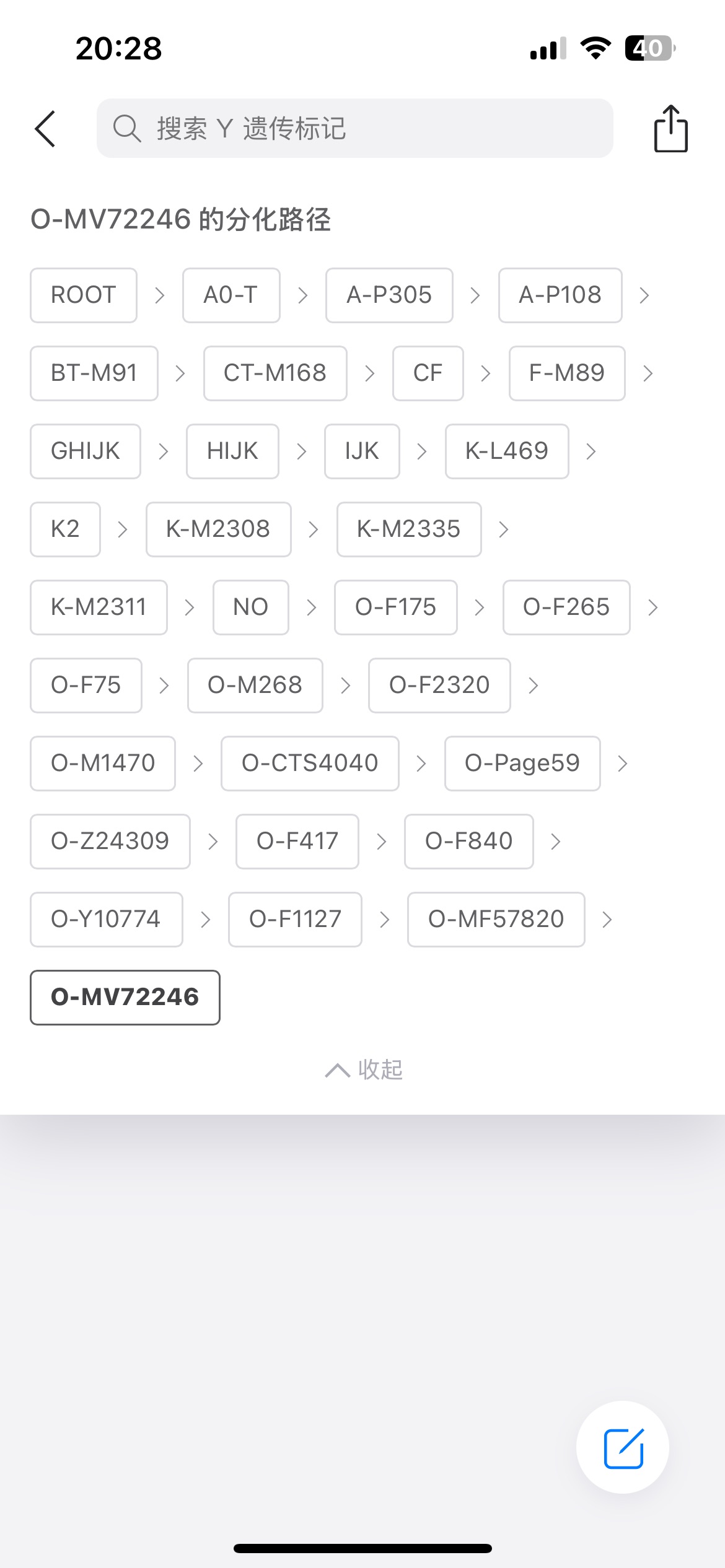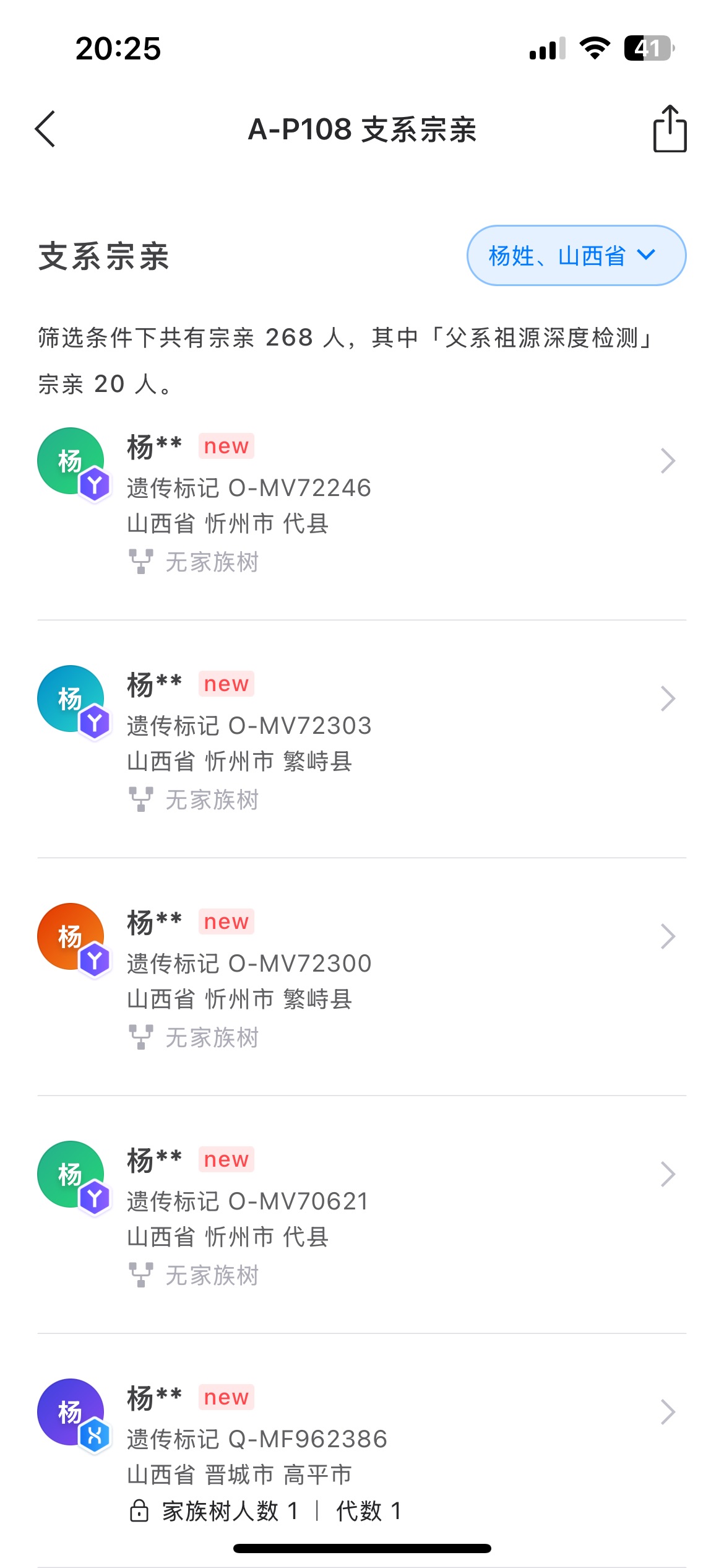 今天又出来了几例 三地三个家族了 山西是M95下游 江苏是793下游 这两支大概550年左右前共祖 河北那支350年共祖 另外一个特点 每个地方测了6个 串了的大概2个 串种概率1/3