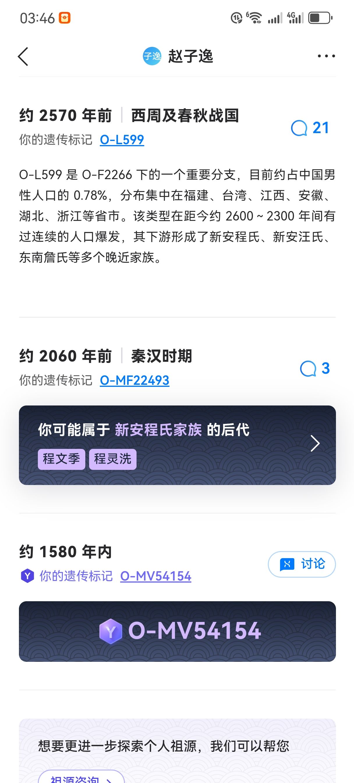举报该帖子 一直以为我祖上是赵氏,没想到测出来是新安程氏,是什么时候改姓了吗12-02· 412 浏览3 评论子逸 赵子逸 3 条评论 热门最新秦礼 秦礼 12-02你跟我一支都是36192下的添加评论点赞 举报该评论 举报该评论 举报类型 违法违规 色情低俗 时政不实信息 引导站外加群 冒充他人 谩骂攻击 网络暴力 其他 无数据 举报描述 举报截图 提交取消评论 西门山人 12-02你可以先组织动员明清家族内部再测几个,确定家族的父系类型再说。添加评论点赞 举报该评论 举报该评论 举报类型 违法违规 色情低俗 时政不实信息 引导站外加群 冒充他人 谩骂攻击 网络暴力 其他 无数据 举报描述 举报截图 提交取消评论 滑稽机器人 12-02很正常添加评论点赞 举报该评论 举报该评论 举报类型 违法违规 色情低俗 时政不实信息 引导站外加群 冒充他人 谩骂攻击 网络暴力 其他 无数据 举报描述 举报截图 提交取消评论 图片关联家族你保存和创建的家族 完成关联单倍群 完成提交评论