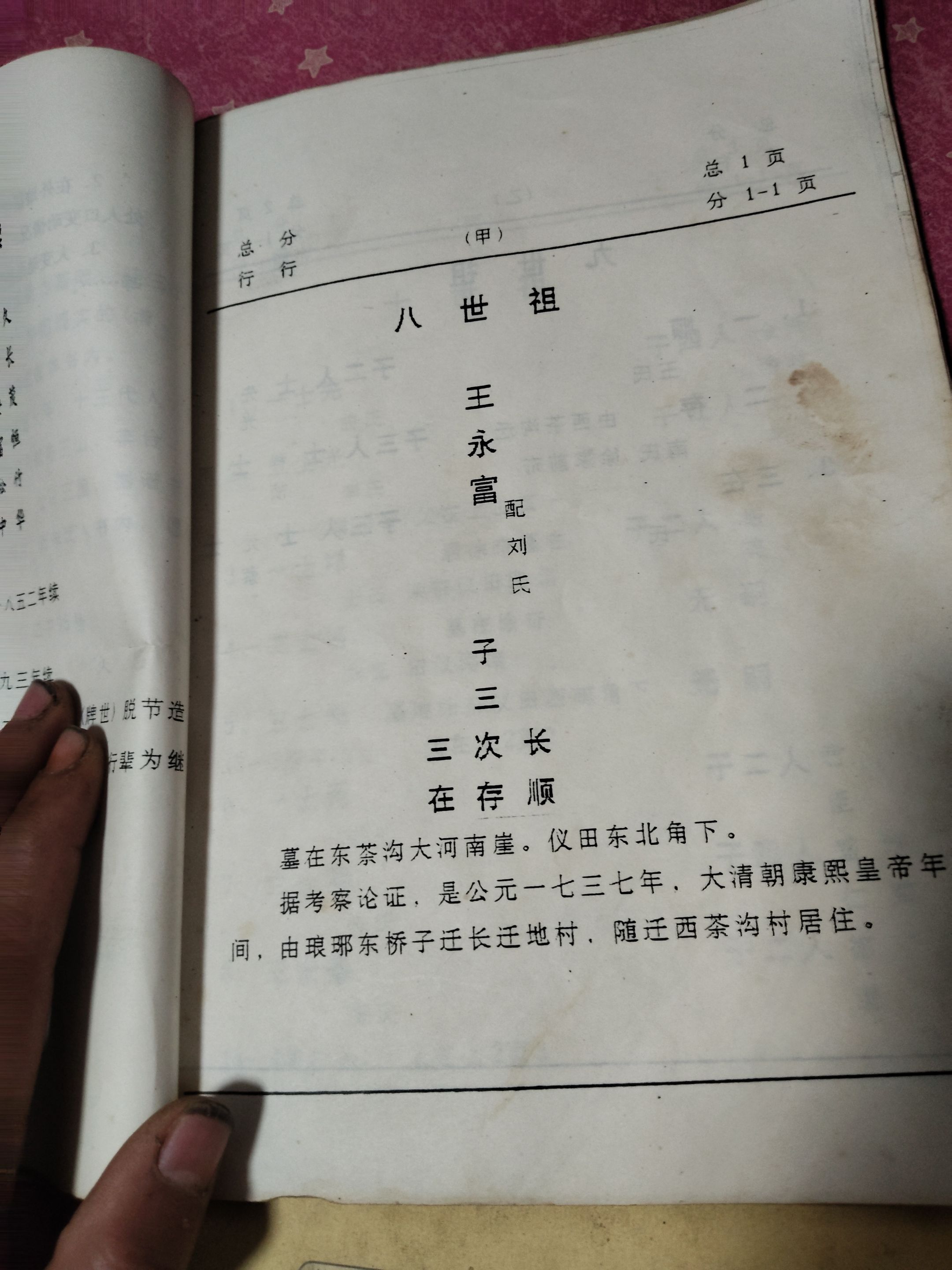 源 源 12-07七老岭王氏,七始祖的名讳是,子花公,子玉公,子贤公,子孝公,良臣公,良忠公,瑛公。子贤子贤公同在九仙山北王家大村,良臣公在莒北张仙,良忠公在离张仙几里路的王家庄子,瑛公留居海青大岭村。有老祖谱互证,《重修莒志》也有记录。添加评论点赞 举报该评论 举报该评论 举报类型 违法违规 色情低俗 时政不实信息 引导站外加群 冒充他人 谩骂攻击 网络暴力 其他 无数据 举报描述 举报截图 提交取消评论