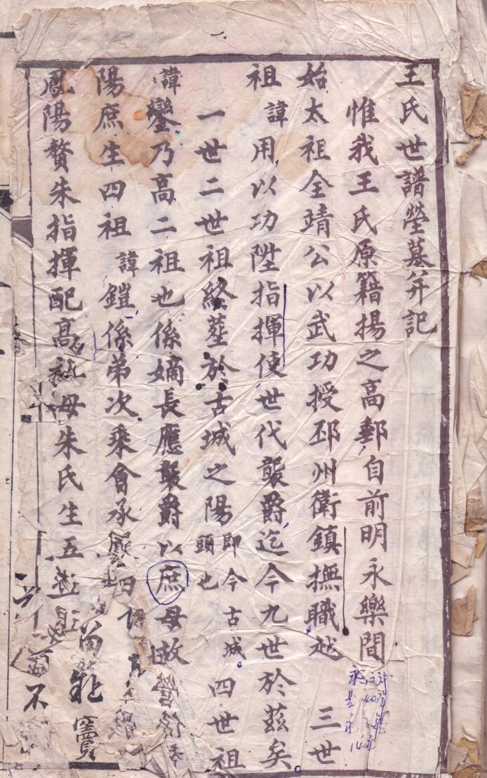 惟我王氏,原籍扬之高邮。自前明永乐间■■■始,太祖全靖公以武功授邳州卫镇抚职。越三世,祖讳用以功升指挥使,世代袭爵,迄今九世于兹矣。一世二世祖终塟于古城之阳(即今古城头也),四世祖讳鑾乃高二祖也,系嫡长,应袭爵,以庶母故营■■阳。庶生四祖讳铠系弟,次承会,承……凤阳,赘朱指挥,配髙■,母朱氏,生五……及五世祖成立,自凤阳归,职已替袭,遂退,生冀望。自置产于史百户营,复诣凤阳……归葬于史营之大潢堤。北邳之半戈山有祖营,系替袭四世祖所名立,三世升指挥使祖并各亲支皆塟于此,自是遂不同营也。直河太潢堤北有二营,右一营塟三四世祖,左一营塟五世祖章,六世祖琪,七世祖确,八世祖徽。(闻后被洪流侵冲,■徽祖并祖母柩仟阳宅东,余俱汩没,世世不无憾于阳侯之肆虐也)