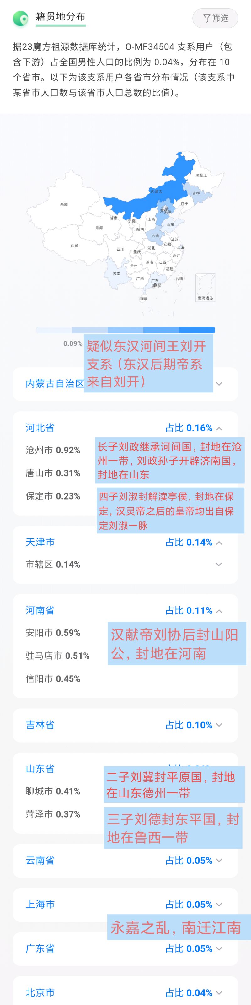 O-MF6722刘氏蔟下面的O-MF34504,目前开出了5个分支,以后翻倍问题应该不大。这支O-MF34504分布上和东汉河间王封地匹配度极高,以河间国所在的沧州最为高频,达到1%左右,刘开儿子的封国鲁北、鲁西、保定等地区均有分布。