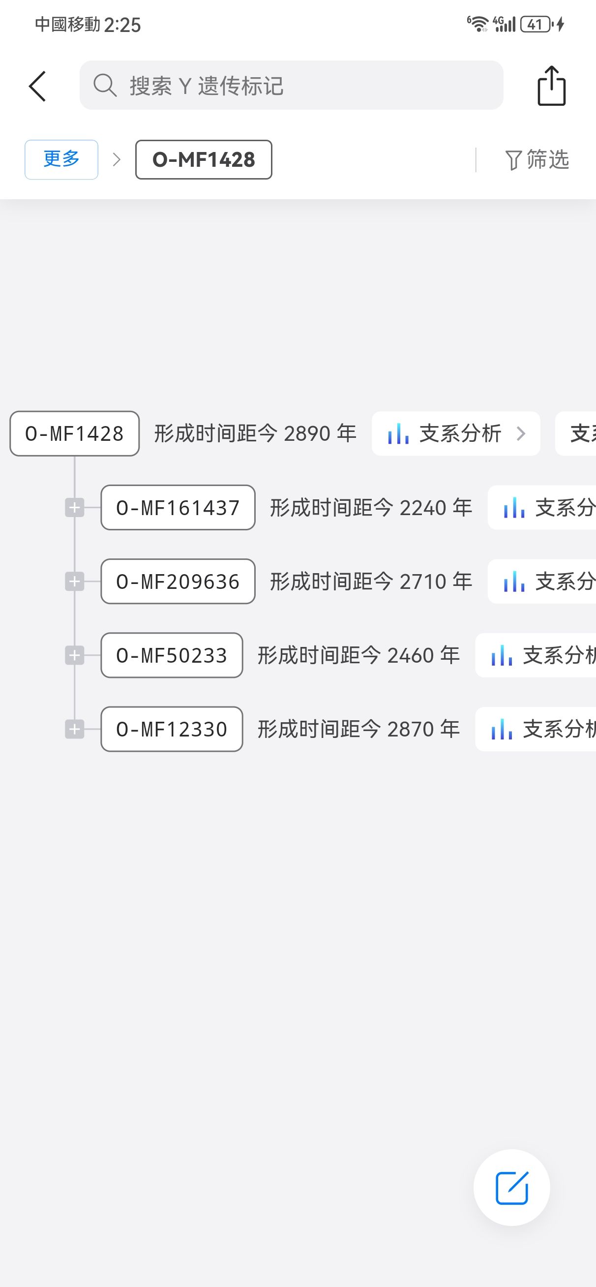 1. 支系高频匹配:龙氏专属遗传标识显著:对O-MF1428下游支系的样本统计显示,其核心分支O-MF12330中龙氏族群占比超70%,且该支系无其他姓氏高频集中分布,形成极强的“单倍群-姓氏”对应关系,排除偶然匹配可能,直指O-MF1428为龙氏特定支系的父系核心。