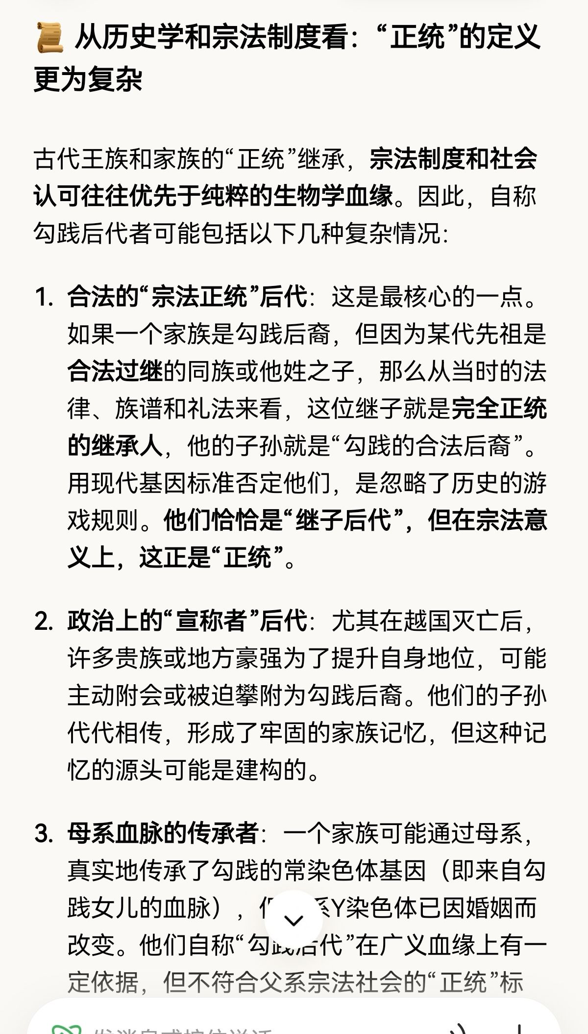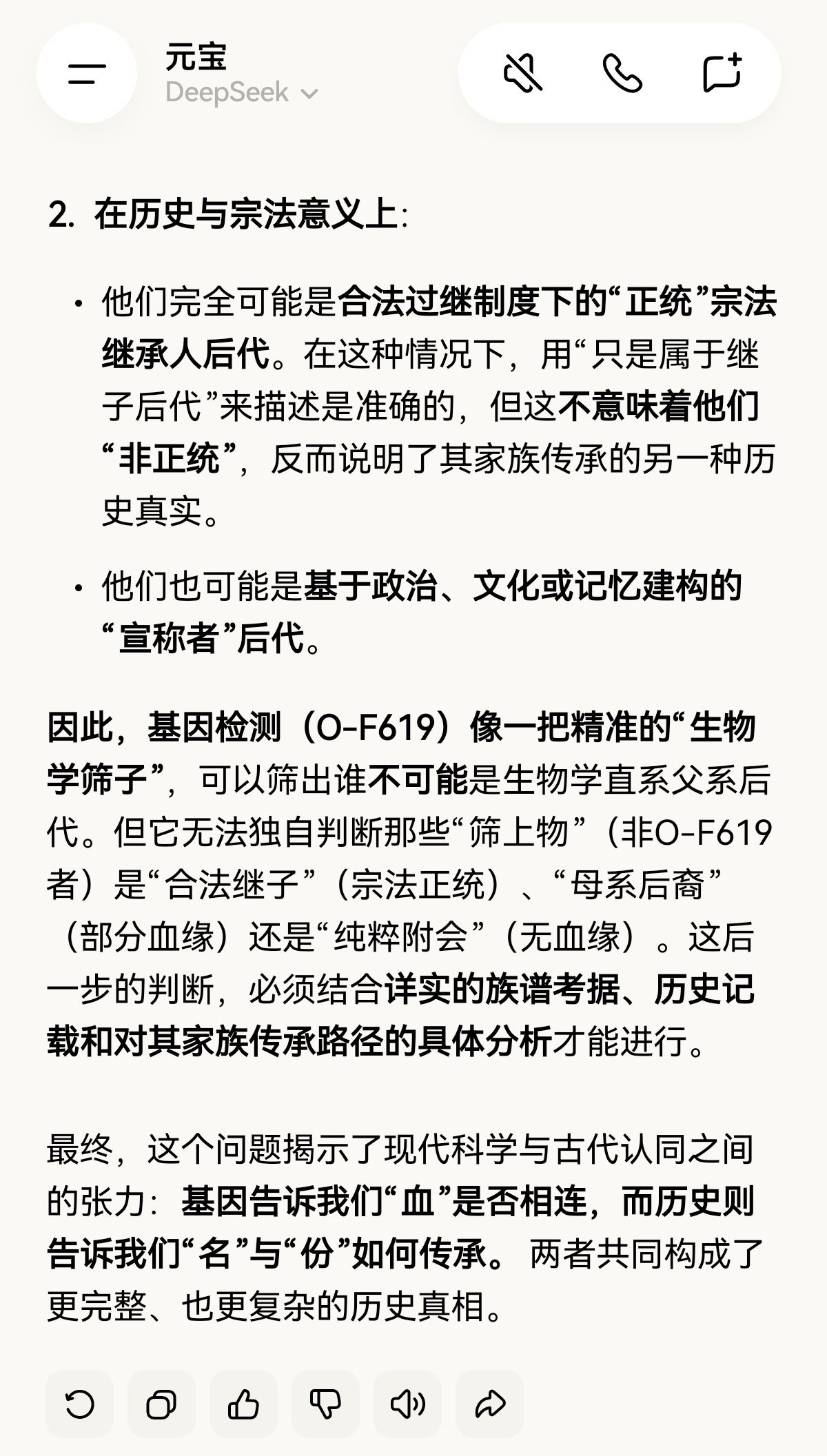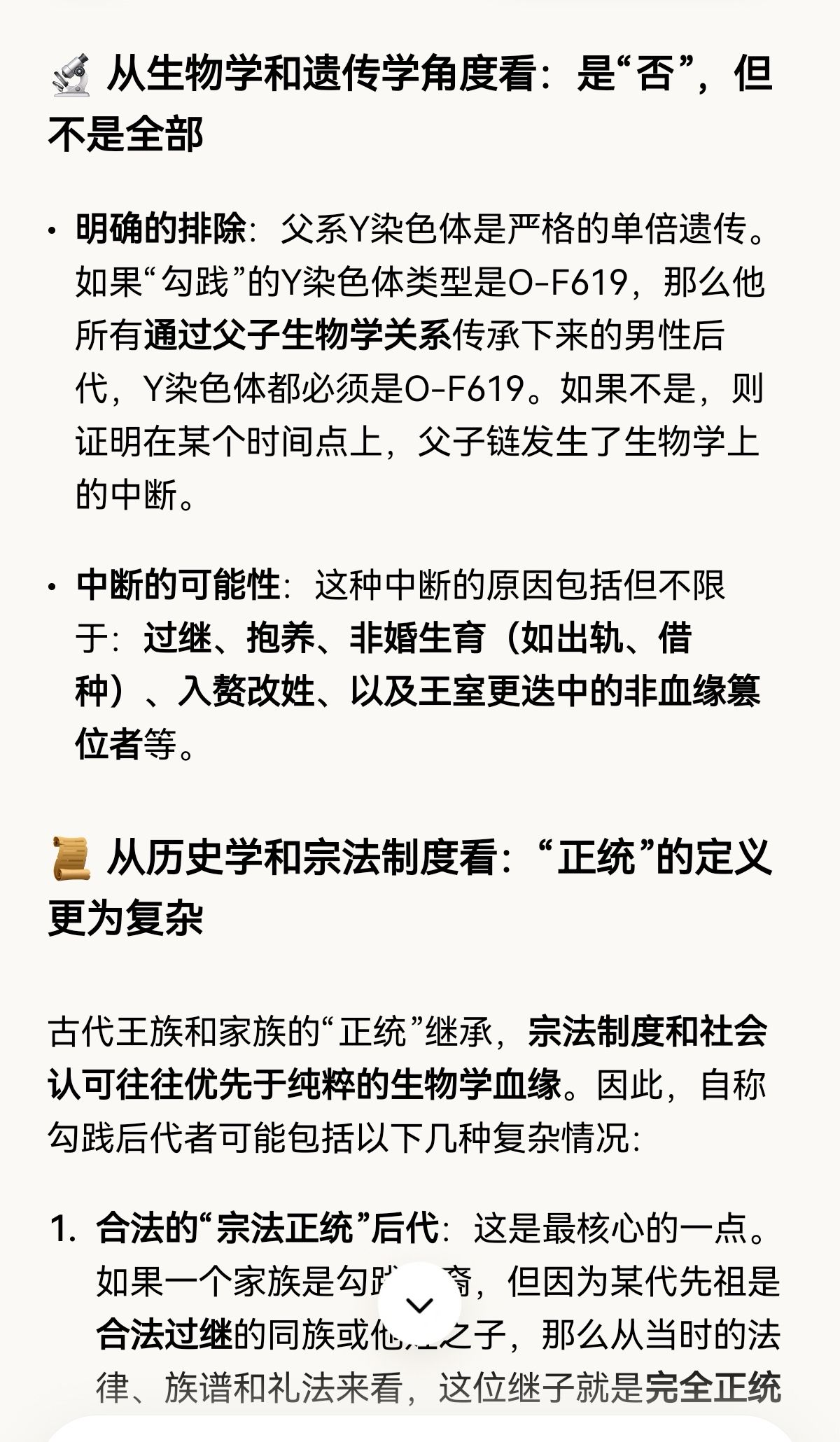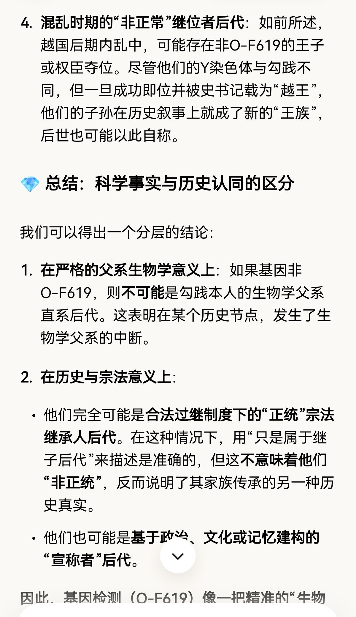 举报该帖子 如何看待自称勾践后代的人非O-F619或O-F656!前天 04:12· 460 浏览11 评论 振鸿 在古代宗法制度下,存在过继、抱养等情况,“继子”恰恰是“正统”。过继是合法的继承手段,被收养的继子会记入族谱,承担祭祀,继承政治身份与社会资源。从礼法和历史记载看,他们是完全合法的“后代”。如果勾践一系在某个世代因无子而收养同族甚至他姓子嗣,这个孩子在当时就是“正统”继承人,后代也自然属于“勾践后代”。然而由于过继的原因(包括非正常生育),他们不是血缘上的后代,但是他们继承了勾践王室的政治身份,并世世代代传承和祭祀,也可以说是勾践的后代。所以我们在检测父系单倍群,如果在自称后代中检测不到对应的单倍群,就否认或推测F656或F619不是越王(勾践)的血缘基因群。 11 条评论 热门最新尧舜 尧舜 前天 11:31添加评论3 赞 举报该评论 举报该评论 举报类型 违法违规 色情低俗 时政不实信息 引导站外加群 冒充他人 谩骂攻击 网络暴力 其他 无数据 举报描述 举报截图 提交取消评论 振鸿 前天 05:16添加评论3 赞 举报该评论 举报该评论 举报类型 违法违规 色情低俗 时政不实信息 引导站外加群 冒充他人 谩骂攻击 网络暴力 其他 无数据 举报描述 举报截图 提交取消评论 西门山人 前天 06:39我们所谓的宗法、家谱,其实都只是从明代中后期民间开始修家谱算起。你不会以为明代开始修的家谱,往上追溯的唐宋甚至秦汉上古都是没问题的吧?现在真实的现实中,过个三四代连太爷爷的名字都不知道,何况古代文化水平几乎没有、战乱又多的时候。3 评论2 赞 举报该评论 举报该评论 举报类型 违法违规 色情低俗 时政不实信息 引导站外加群 冒充他人 谩骂攻击 网络暴力 其他 无数据 举报描述 举报截图 提交 振鸿 前天 07:14明清时代最看重宗法传承,只要家里没有丁,过继、抱养、拐买都要有个男丁。所以父系单倍群很多是对不上宗的,只有同性同源不同宗。点赞 举报该评论 举报该评论 举报类型 违法违规 色情低俗 时政不实信息 引导站外加群 冒充他人 谩骂攻击 网络暴力 其他 无数据 举报描述 举报截图 提交取消评论 西门山人 前天 15:35@振鸿:传统宗法传承下只有过继,而且过继也是过继的兄弟或堂兄弟的儿子,也是同个父系。抱养这种都不会上谱的,也就是现代没有宗法束缚了才会有抱养的情况上家谱,甚至有些都直接不公开。但这种情况,其实也很容易梳理出家族的父系情况,追溯的也只是家族明清的始迁祖而已,跟更早的文化上的祖先八竿子打不着。点赞 举报该评论 举报该评论 举报类型 违法违规 色情低俗 时政不实信息 引导站外加群 冒充他人 谩骂攻击 网络暴力 其他 无数据 举报描述 举报截图 提交取消评论取消评论尧舜 尧舜 今天 06:42有些人永远不会放弃一个撒谎和造假的机会,他的性格就是这样,不撒谎活不下去,这就是极少数汉人的一个毛病。添加评论1 赞 举报该评论 举报该评论 举报类型 违法违规 色情低俗 时政不实信息 引导站外加群 冒充他人 谩骂攻击 网络暴力 其他 无数据 举报描述 举报截图 提交取消评论尧舜 尧舜 前天 11:23添加评论1 赞 举报该评论 举报该评论 举报类型 违法违规 色情低俗 时政不实信息 引导站外加群 冒充他人 谩骂攻击 网络暴力 其他 无数据 举报描述 举报截图 提交取消评论楚童 楚童 前天 11:37基因检测结果只能是证明某人的血缘关系,并不能否定家谱的世系传承,考古结果与基因检测结果是对家谱世系的补充与,基因检测结果主要是对于一些寻根,寻亲人员起主要作用。添加评论点赞 举报该评论 举报该评论 举报类型 违法违规 色情低俗 时政不实信息 引导站外加群 冒充他人 谩骂攻击 网络暴力 其他 无数据 举报描述 举报截图 提交取消评论尧舜 尧舜 前天 10:41宋朝百家姓这本书记载的姓氏起源,前100个姓氏错误率应该是百分之百,没一个正确。汉朝时期记载的姓氏部分是正确的。添加评论点赞 举报该评论 举报该评论 举报类型 违法违规 色情低俗 时政不实信息 引导站外加群 冒充他人 谩骂攻击 网络暴力 其他 无数据 举报描述 举报截图 提交取消评论 振鸿 前天 04:53所以我们在确认某个人的父系单倍群时,不能单纯用后代的基因来推测是某人,仅能作参考。添加评论点赞 举报该评论 举报该评论 举报类型 违法违规 色情低俗 时政不实信息 引导站外加群 冒充他人 谩骂攻击 网络暴力 其他 无数据 举报描述 举报截图 提交取消评论 图片关联家族你保存和创建的家族 完成关联单倍群 完成提交评论