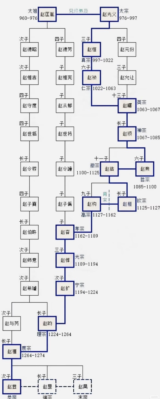 宋理宗、宋度宗、端宗、恭帝以及崖山海战时由陆秀夫背负跳海殉国的宋少帝赵昺,或均为刘邦→刘启→刘秀的生物学后代。这与宋朝皇位继承中常因生育问题而从宗室过继子嗣有关。南宋末期,皇位传至赵世括→赵令稼这一支,上述几位宋朝皇帝均为赵世括的后代。
