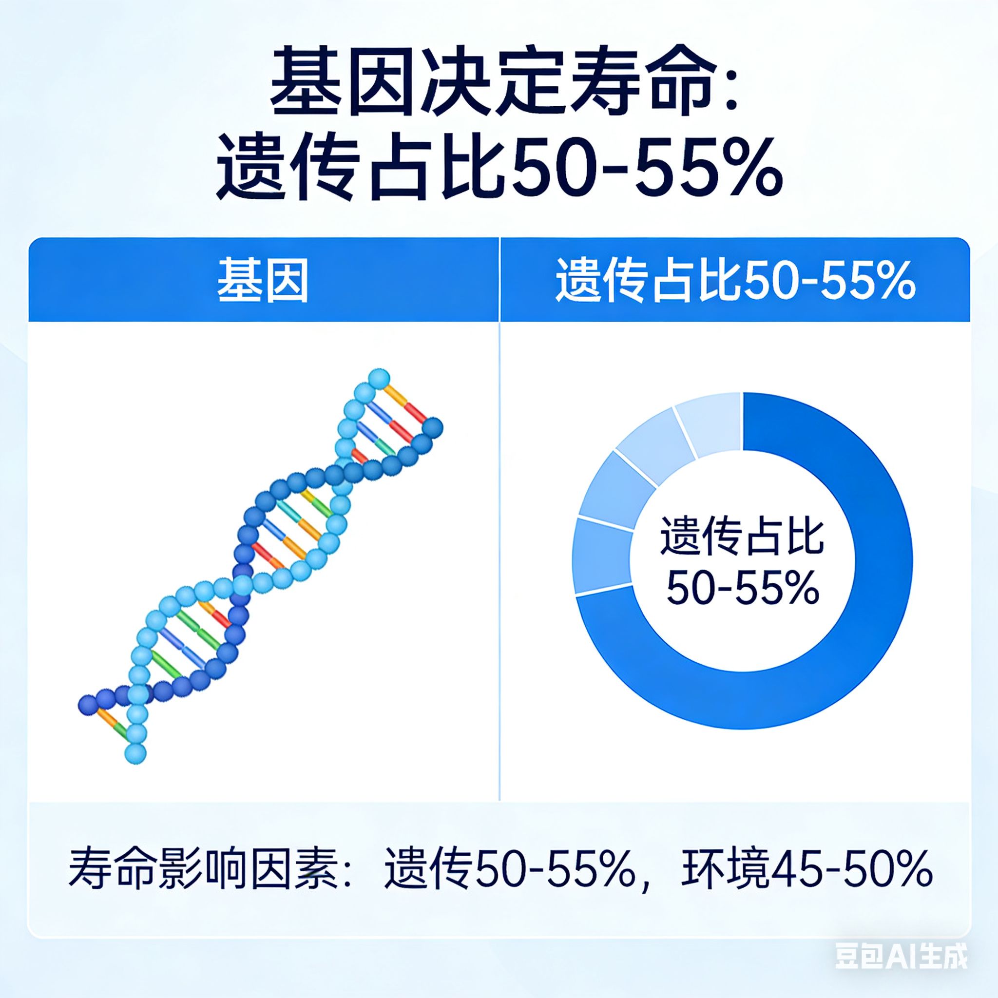 · 基因是“起跑线”,而非“终点线”:基因决定了你寿命的“潜在上限”(约55%),但仍有45% 的空间由生活方式、环境等因素决定。