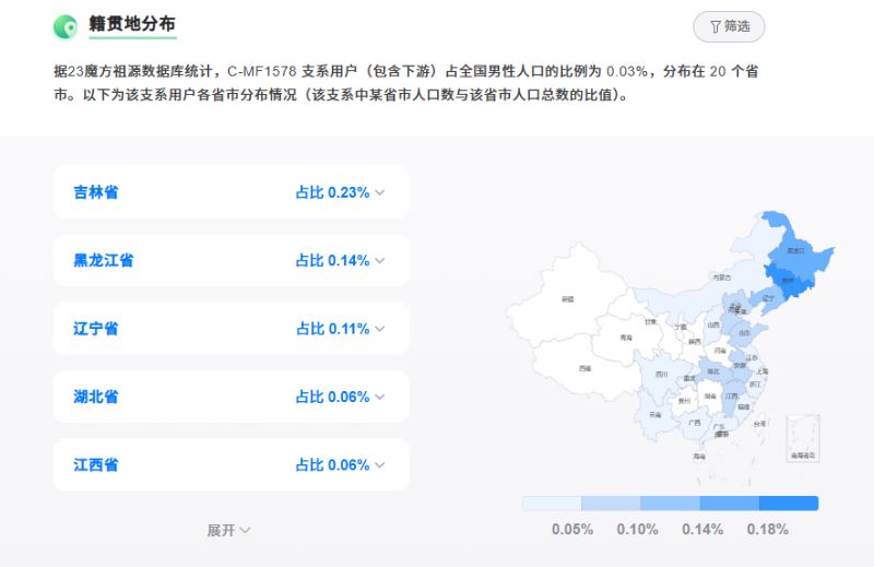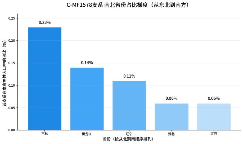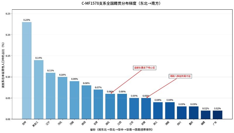 清代 “闯关东” 是华北人向东北移民,但 C-MF1578 在东北的高占比说明,更早的东北族群南下留下的遗传印记,在现代人口中仍占主导。
