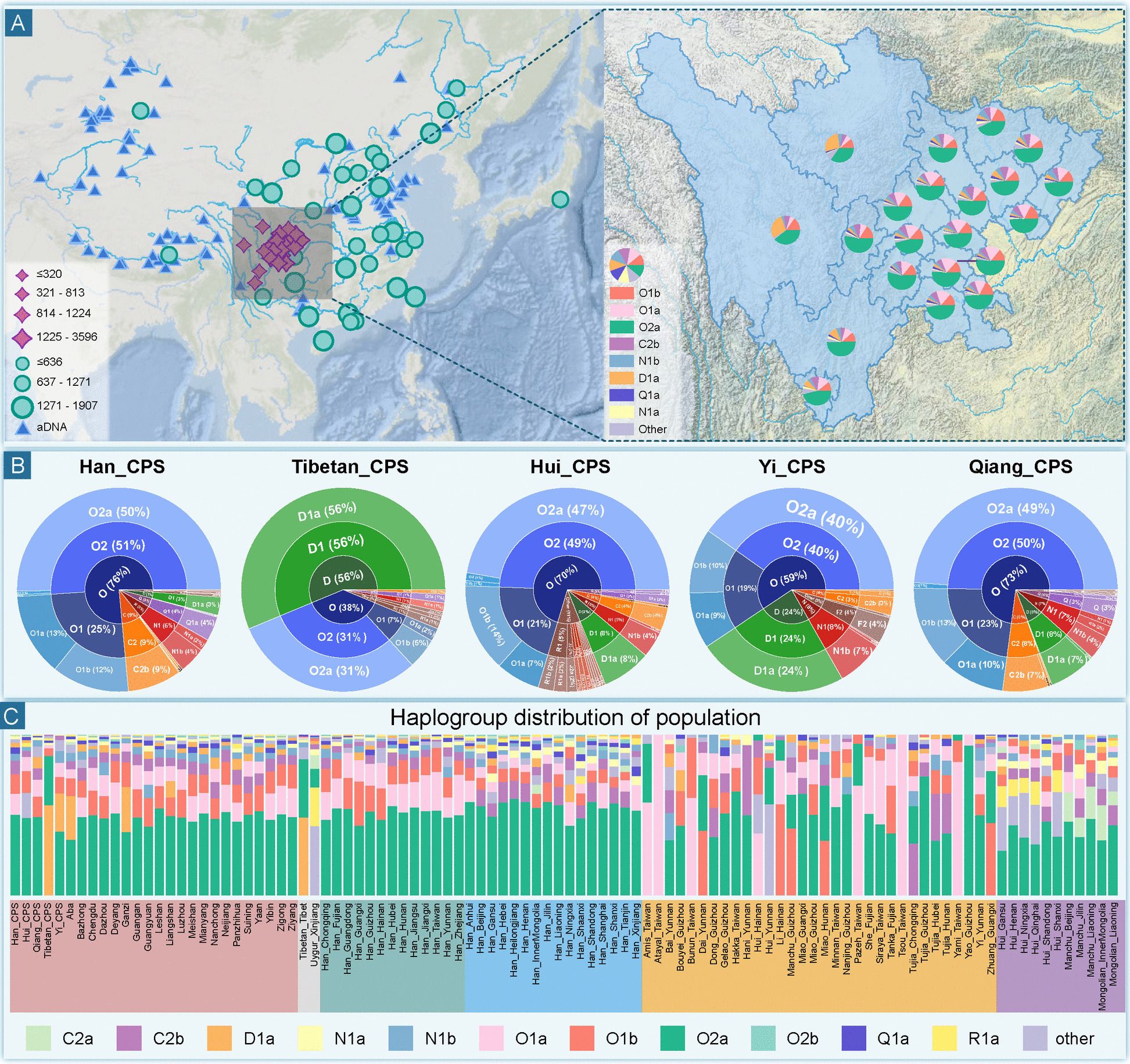 研究团队对成都平原及周边地区的现代人群进行了大规模的采样,重点分析了 Y 染色体(父系遗传) 的单倍群频率和全基因组序列。通过对比古代 DNA 数据(来自黄河流域、长江流域及周边遗址)和现代人群数据,重建了该地区的父系遗传演化图谱。